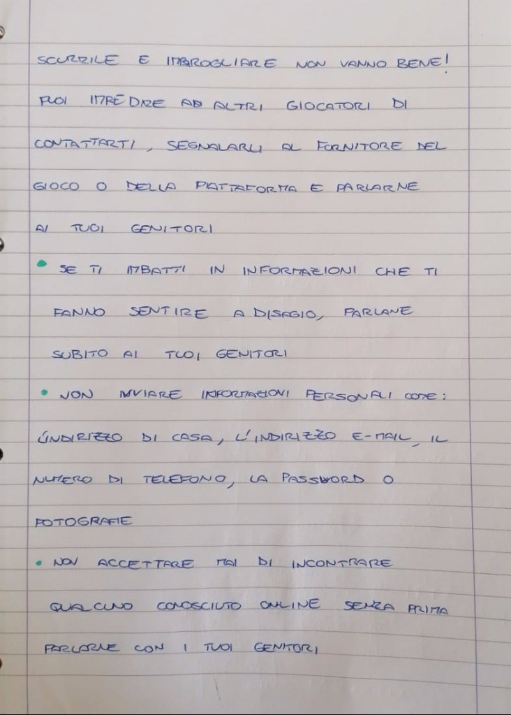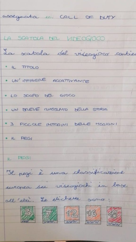 In plenaria si introduce l’argomento PEGI chiedendo ai bambini se sanno di cosa si tratti e poi approfondendo con il sito https://pegi.info/it. Con l’aiuto dei bambini più esperti si scrivono sul quaderno che cosa debba essere presente sulla scatola del videogioco poi si procede alla progettazione e realizzazione.