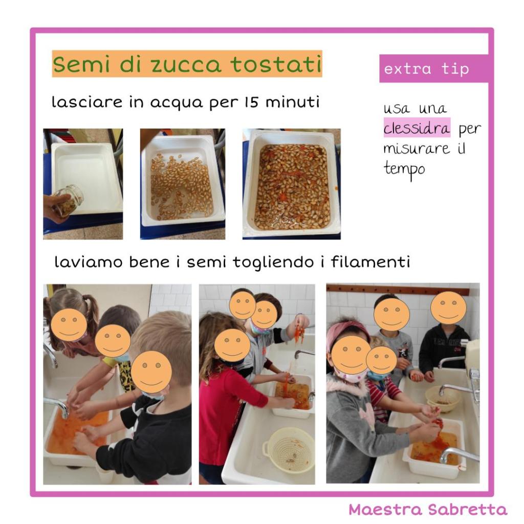 Durante lo svolgimento delle varie fasi facciamo descrivere la zucca e i suoi semi proponendo nuovi aggettivi, poi facciamo ripercorrere le fasi eseguite compilando la scheda.
