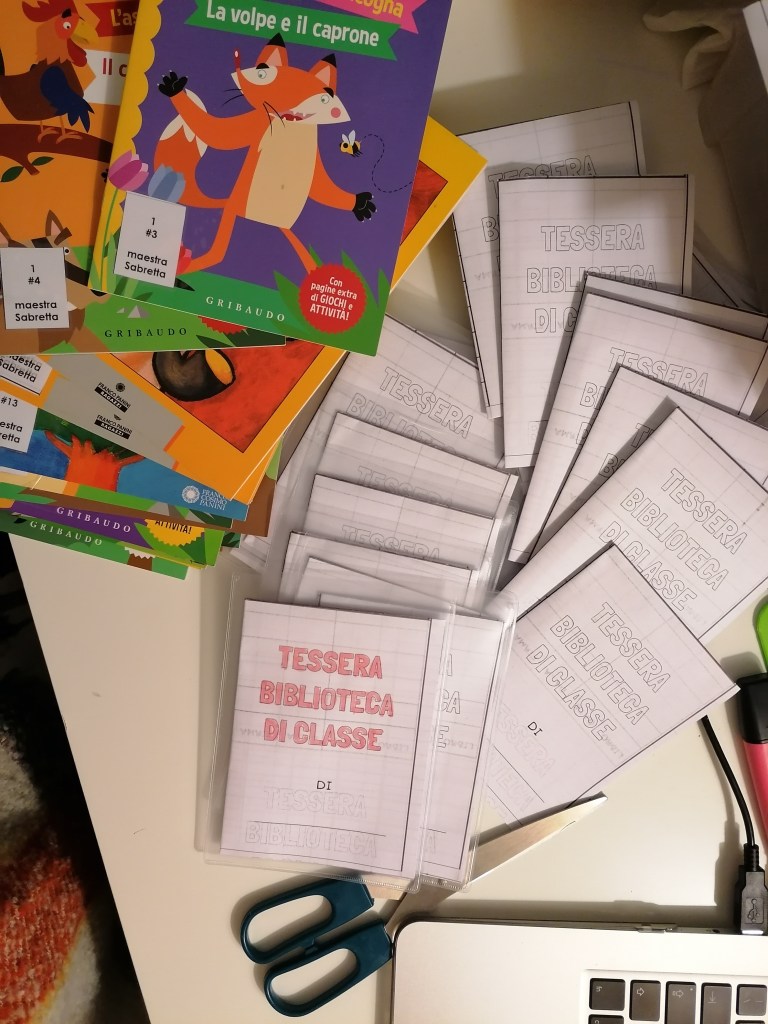 Grazie al buono decenti mi sono tolta lo sfizio di creare la mia biblioteca di classe. Ho sempre faticato nel trovare un numero di libri in stampato maiuscolo sufficienti a soddisfare il fabbisogno delle mie classi prime nella biblioteca del paese così ho deciso di creare biblioteca tutta mia e dei bambini, con i libri della nostra classe, con il nostro sistema di prestito e con la nostra tessera “di lettura”.