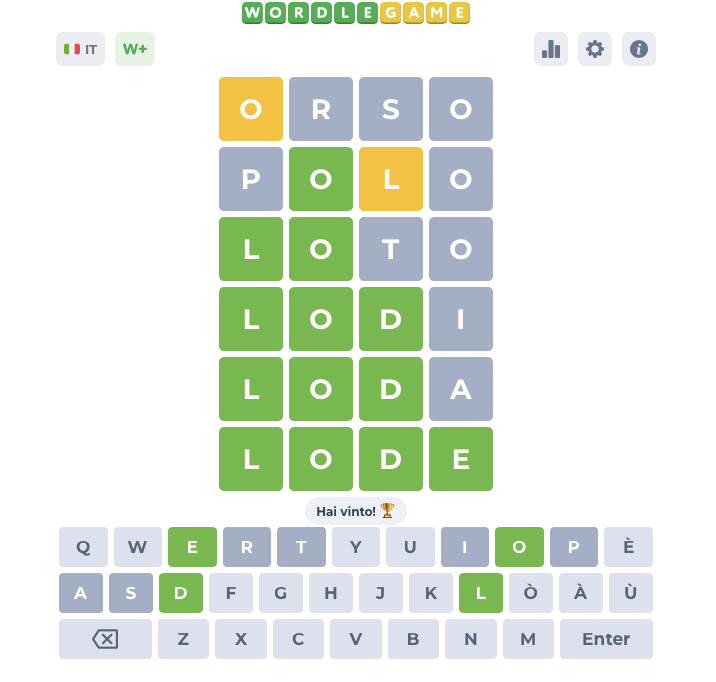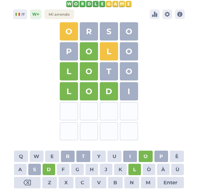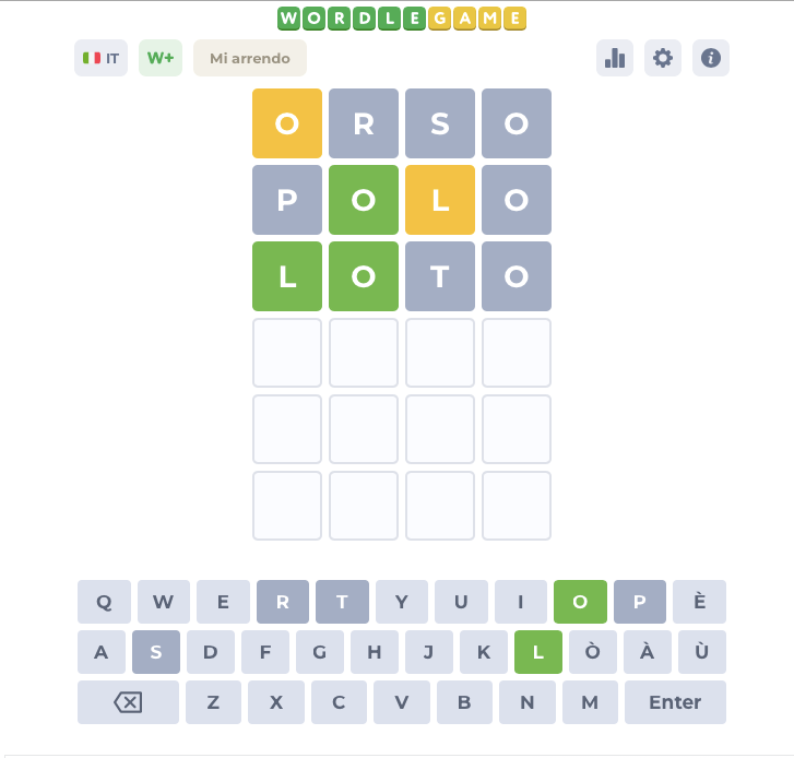 Sul sito https://wordlegame.org si può scegliere il numero di lettere (da 4 a 11) e la lingua in cui si vuole giocare. Ecco un esempio di gioco giocato online con parola di 4 lettere.