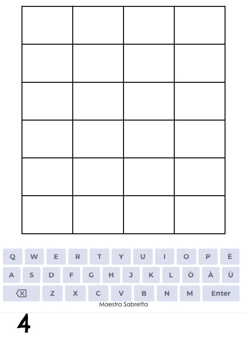 Si inizia con l’inserimento di una parola a caso purché del numero di lettere richiesto. L’insegnante passerà tra i banchi colorando di giallo le lettere contenute nella parola, ma non nella posizione corretta, di verde quelle che sono nella parola e nella posizione corretta. I bambini riporteranno nella tastiera sottostante i colori delle varie lettere indovinate e cerchieranno in grigio le lettere usate che però non si trovano nella parola da indovinare, e che quindi non si devono più utilizzare.