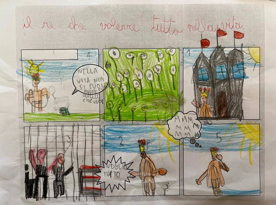 Dopo aver parlato di questa emozione i bambini a coppie hanno realizzato, con il template fornito, le sei sequenze più significative della storia, decidendo di far parlare i personaggi attraverso i fumetti. Infine ho chiesto loro di inventare un titolo per la storia ascoltata.