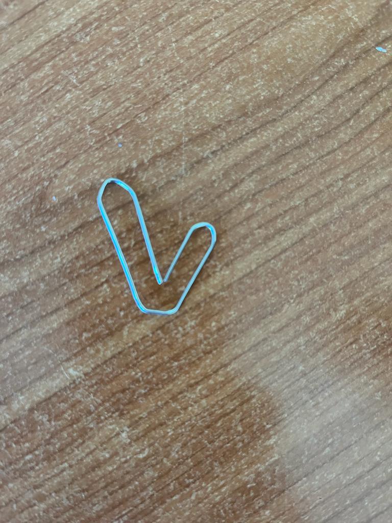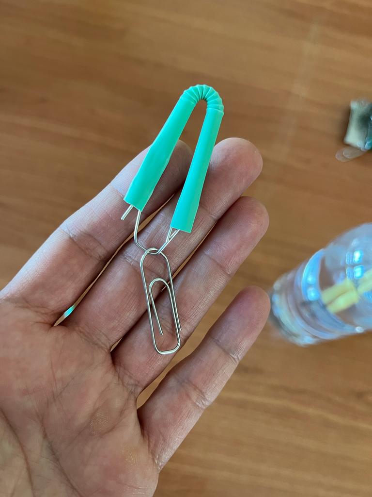 Aprire la graffetta in modo da formare una V. Schiacciare bene le punte della V per farle entrare all’interno della cannuccia. INquesto modo abbiamo realizzato il diavoletto di Cartesio.