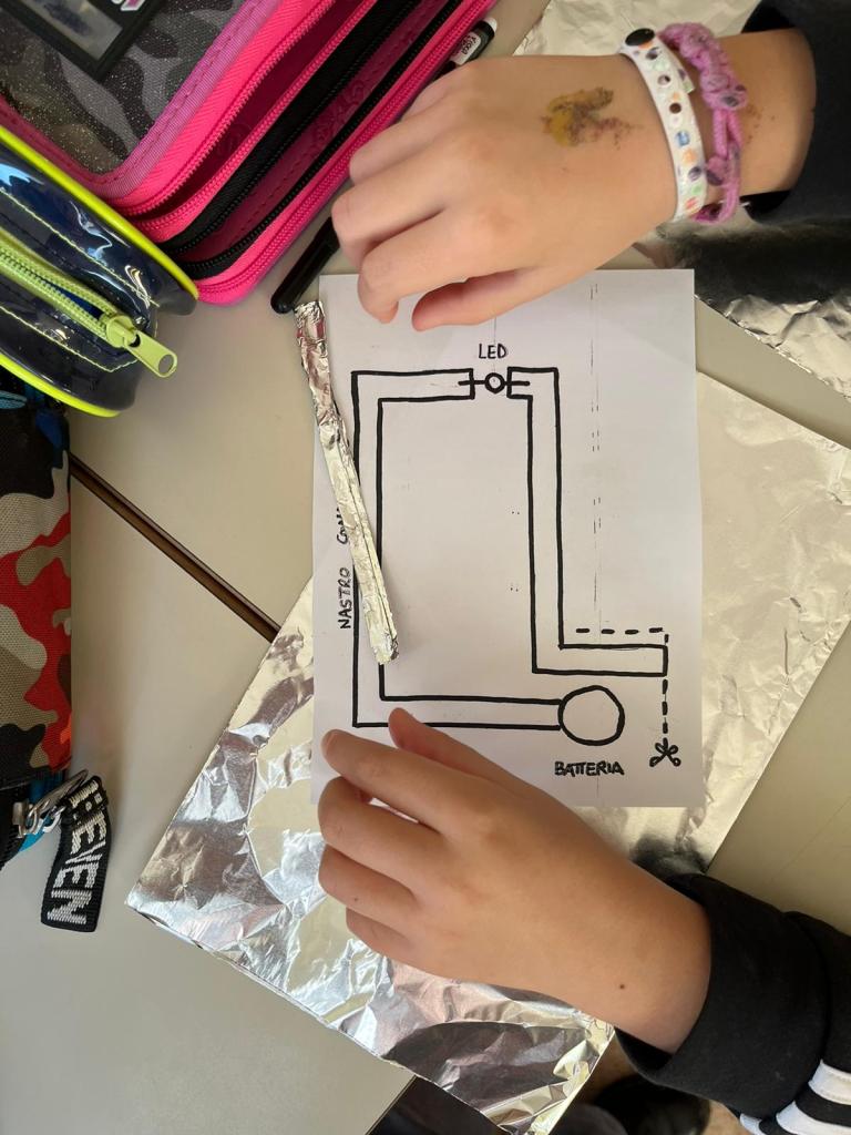 1. Distribuire ad ogni bambino 1 batteria, 1 Led, un pezzo di foglio di alluminio e una matrice del circuito