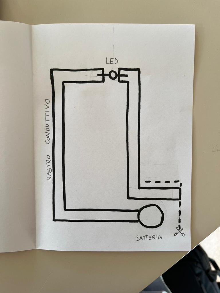 Realizzare il disegno e ritagliare la parte che si deve illuminare. Riempire lo spazio ritagliato con la carta velina in modo che sia più trasparente del normale cartoncino. Creare un pulsante in corrispondenza dell’angolo in cui, premendo, il circuito si chiude illuminando il led.