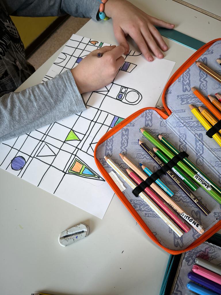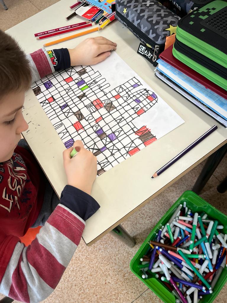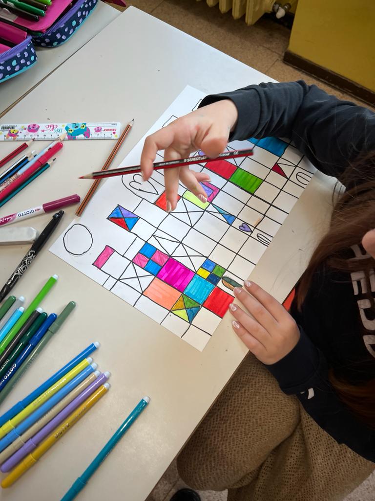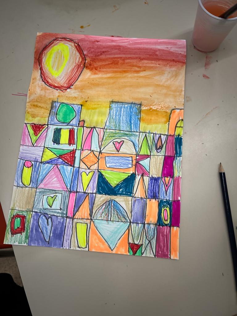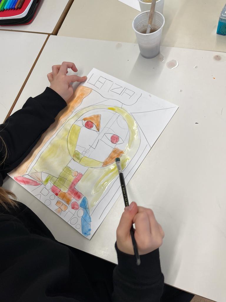 Sperimentiamo l’arte di Klee realizzando paesaggi geometrici, il nostro ritratto e il gatto con l’uccellino – usiamo tecniche miste di acquarelli, pennarelli e matite.