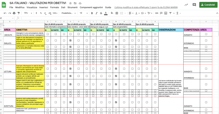 griglia di valutazione in cui riporto gli obiettivi di apprendimento, le attività che propongo per raggiungerli, le osservazioni durante il percorso, il livello raggiunto a fine mese o bimestre (evidenzio in giallo gli obiettivi su cui sto lavorando)