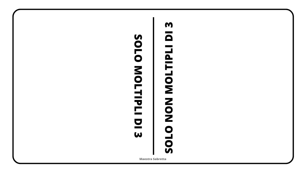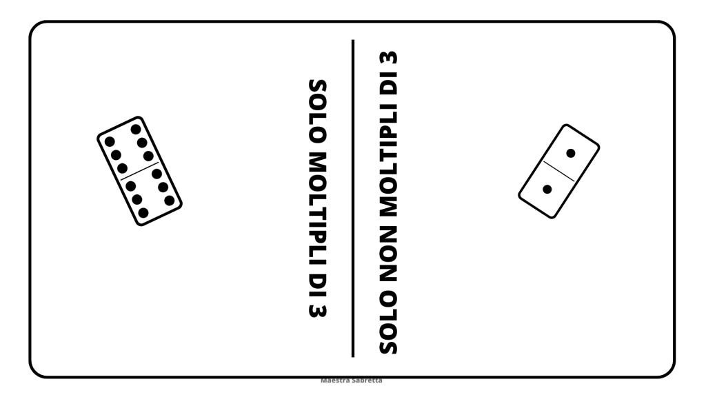 GIOCO – I MULTIPLI DI 3: gioco di coppia. Le tessere sono tutte girate in su per vedere le quantità. Un giocatore è dalla parte dei multipli di 3 e l’altro dalla parte dei NON multipli di 3. Ogni giocatore sceglie una tessera a turno da inserire nella propria sezione. A seconda della parte a cui appartiene il giocatore deve calcolare il prodotto presente sulla tessera che sceglie in modo che sia un multiplo o non-multiplo di 3 e posizionarla nel foglio dalla propria parte. Quando le tessere sono finite si procede a fare la somma dei punti e vince chi ne ha di più.