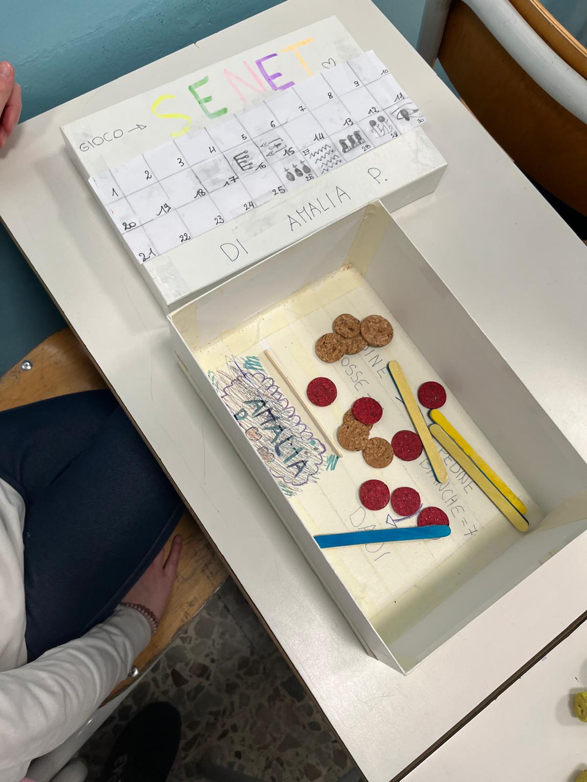Ho proposto ai bambini un’attività creativa: realizzare il gioco con materiali di recupero. Hanno realizzato tante Senet originalissime.