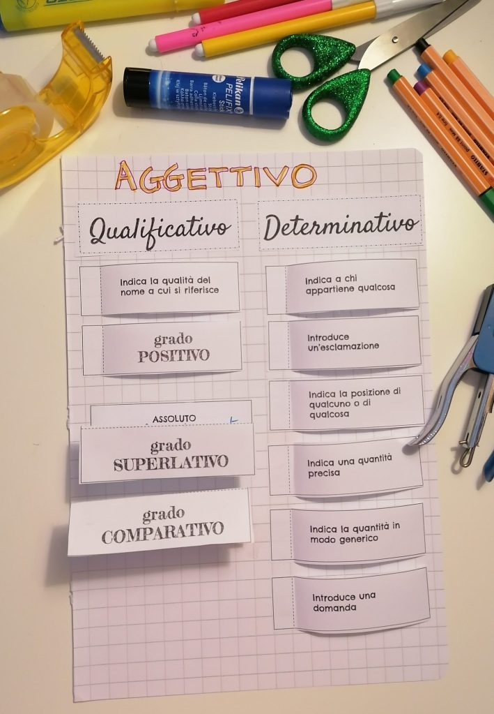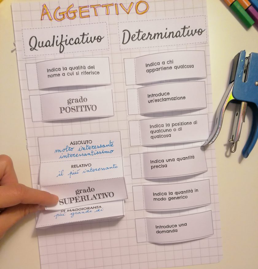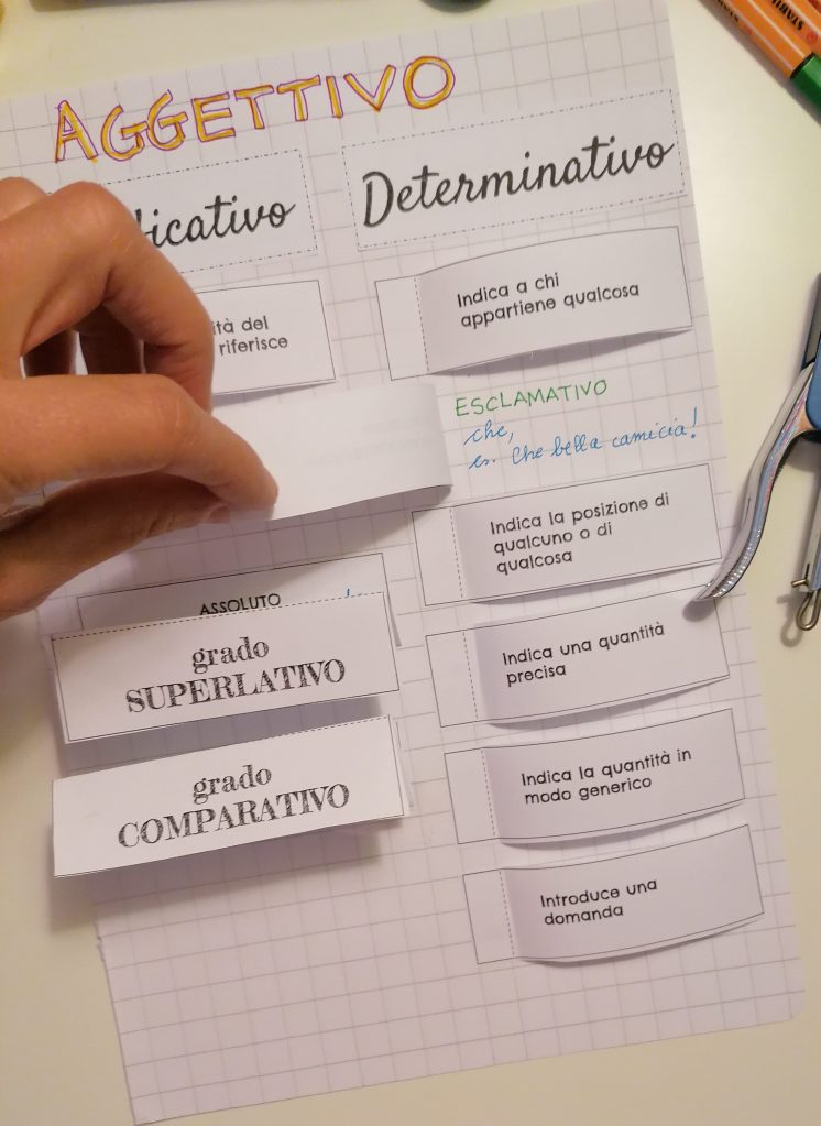 Mi sono chiesta come utilizzare questi preziosi materiali e nello stesso tempo spingere i bambini ad essere attivi nella realizzazione delle mappe. Mi è venuta in aiuto la mia allieva Aleksandra proponendomi la realizzazione di un lapbook su aggettivi e pronomi che, sullo spunto della mappa presente nel libro di testo, facesse attivare il ragionamento e la memoria. Adesso la propongo io a voi perché mi è sembrata un’ottima idea.